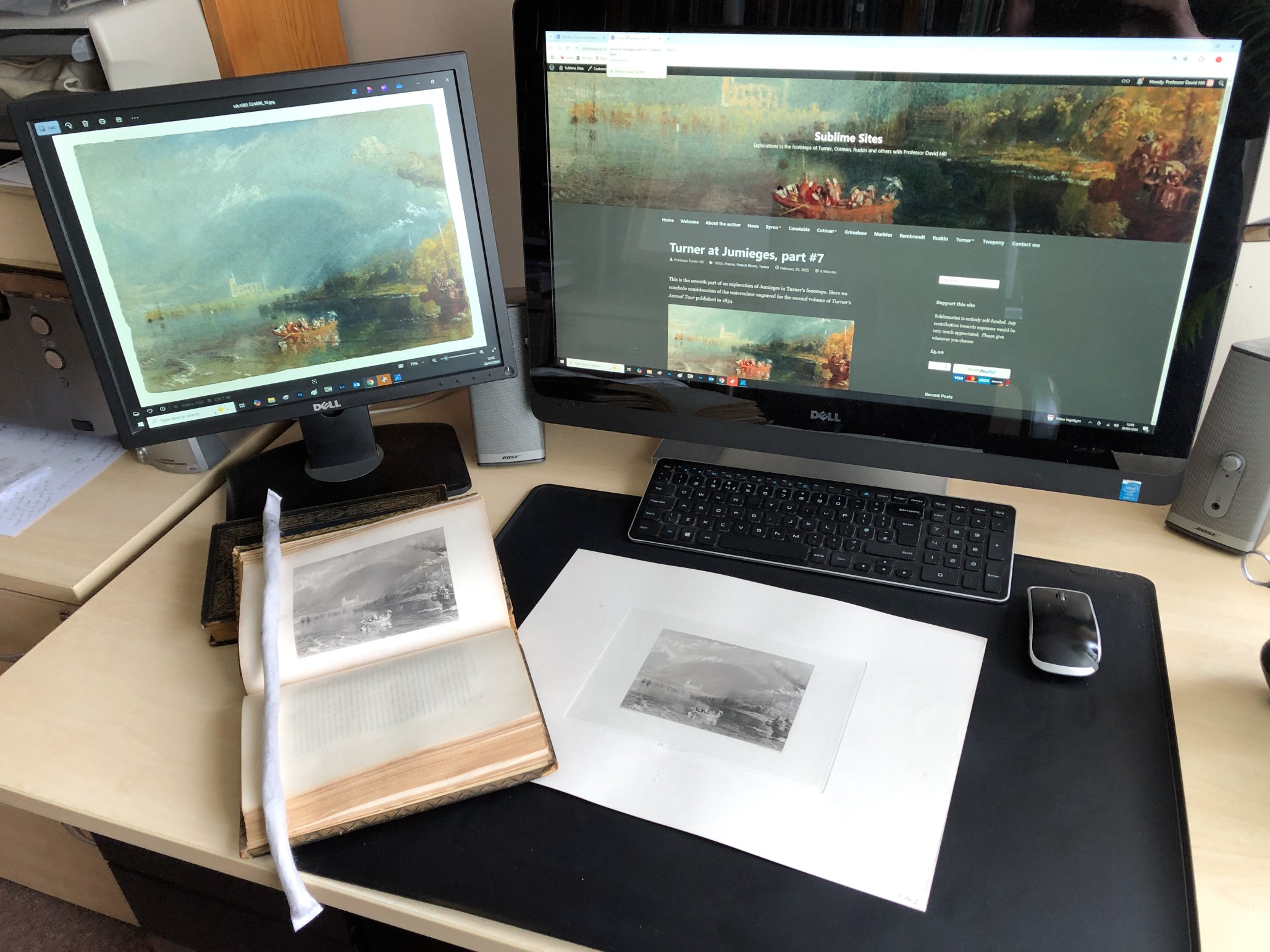 In large measure “Landscape” as a genre is about NOT being there. It speaks to relationships with and within a changing world and it is the medium in which positions in relation to those relations are negotiated. Every new world has its own new technologies of representation, and it is in their spaces that the most relevant dreamwork occurs. In 1834, steel engraving was cutting-edge representational technology, and the illustrated books that it enabled were the ultimate high-risk and urgent cultural ventures of their time. Through such material citizens could form perspective on an ever-widening world, and adjust their knowledge to new epistemological foundations. Everything was in motion, and what was cutting-edge one year was redundant the next. In a future article we might give some thought to the rapid succession of formats in which Turner’s engravings were published. But for the time being it is perhaps sufficient to observe that the book form in which Jumieges was published might have been state of the art in 1834, but its moment was brief. Within four or five years that kind of book began to appear tired, and within ten years its technology of representation began to give way to something entirely new; photography.