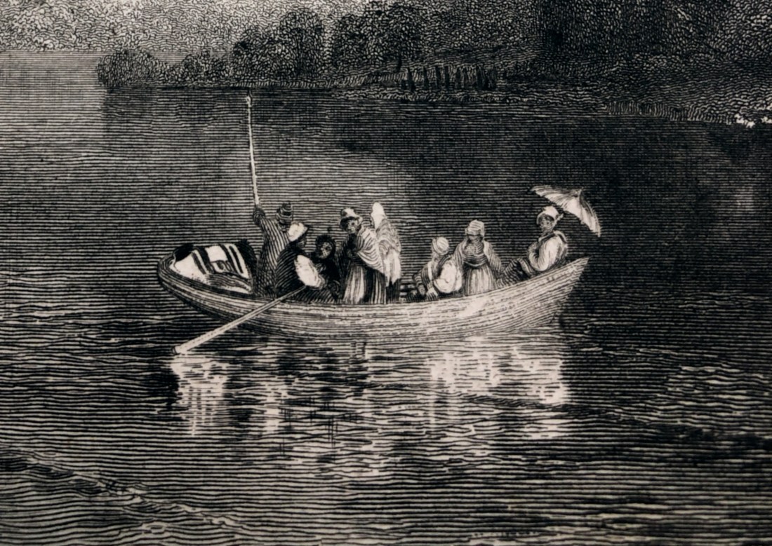 The main event is occurring over the abbey. The ruins act like a lightning rod for the weather. The stones gleam in sudden light perfectly framed by a rainbow. It is almost as if the site was designed to act as a pole for the sublime. This is totally lost on the passengers being whisked away on the steamboat. The rowing boat offers more agency, and more time, and more exposure, but the older mode is not straightforwardly better. The passengers, after all, have been exposed to a soaking, and are more wrapped up in their discomfort than exulting in their experience. In truth being there is very much a mixed blessing.